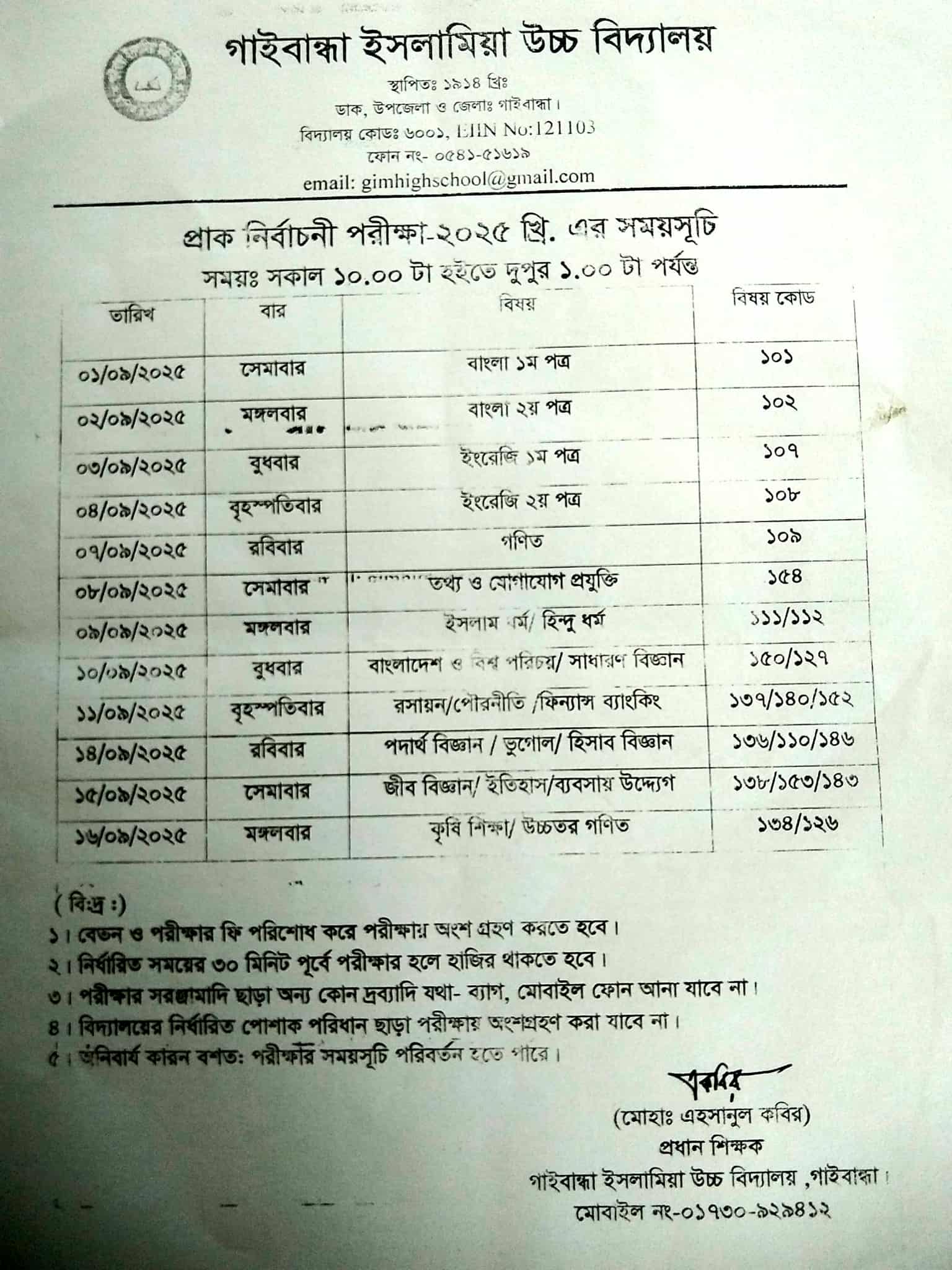 Pre-selection Exam Routine: 01-09-2025